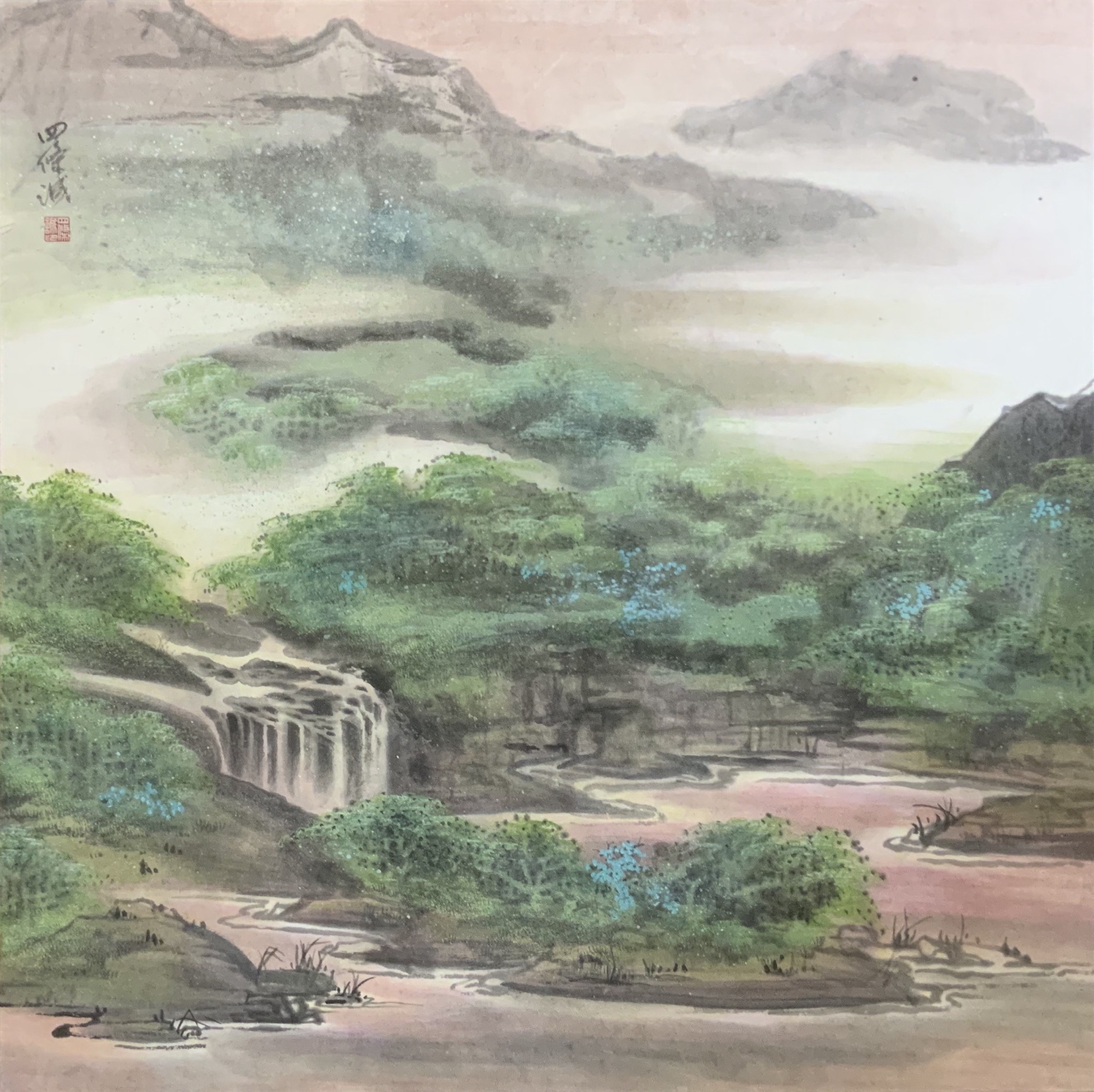 翠霧幽瀑(すいむゆうばく) 【技法・寸法】 生宣紙墨彩 約75cm × 75cm 【制作年】 2023年 【解説】 翠樹霞を抱き、幽瀑声を潤す。 朝暾(ちょうとん)淡く山を染め、雲気遥かに谷を覆う。 静けきにして清く、流れは心を洗う。 一歩踏み入れば、俗界は夢と化すなり。 関連