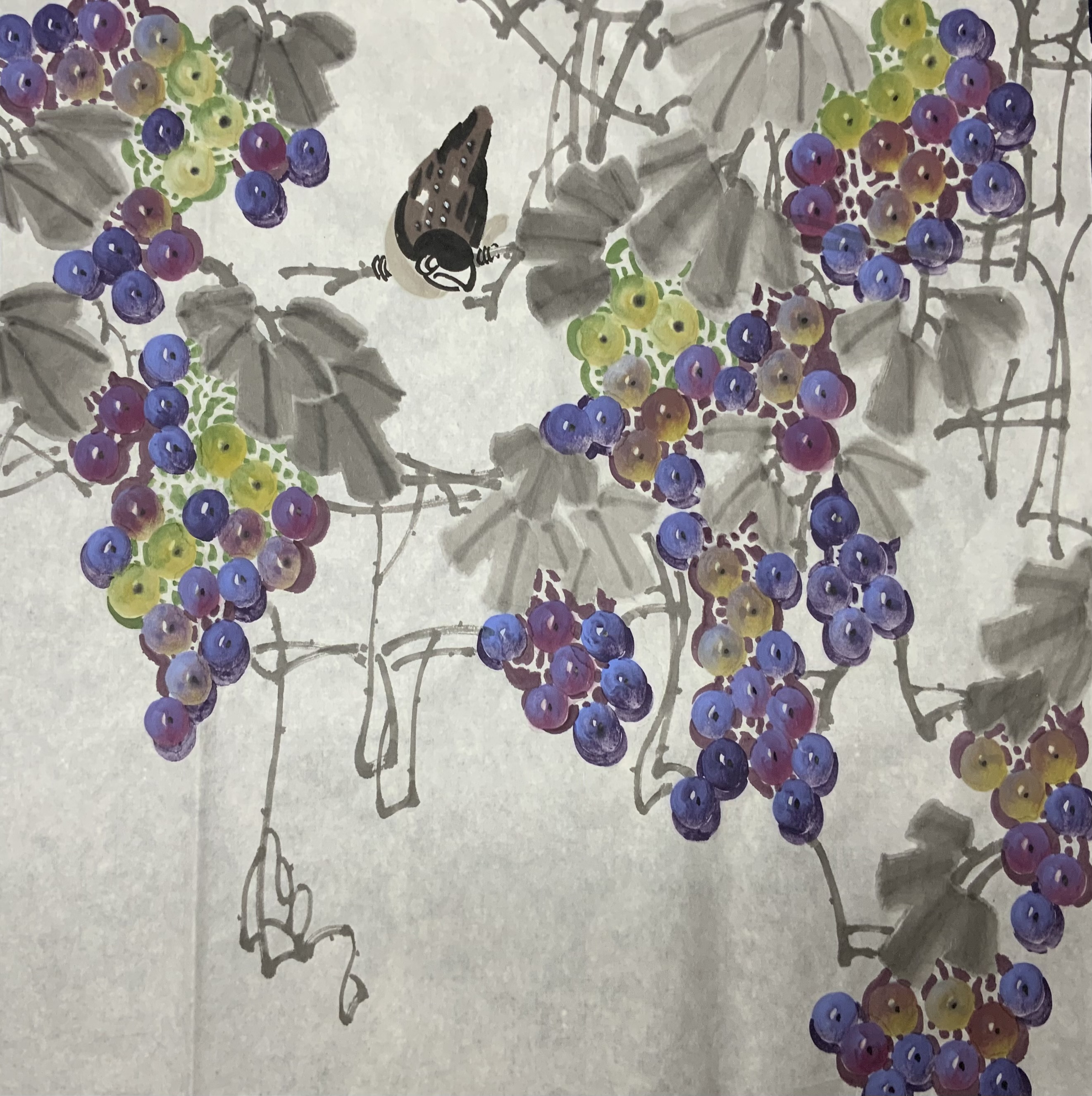 色づき始めた葡萄の房の間を、小さな雀がちょこんと留まっています。紫から黄緑へと移ろう実の色彩は、秋の訪れを告げる自然の調べ。葉脈の柔らかな墨の表現と、果実の鮮やかな彩色が、実りの季節の温もりと生命感を描き出しています。